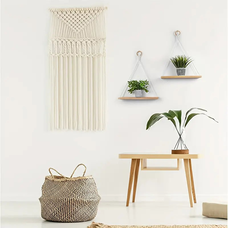 The wall hanging shelf can handle up to 8 pounds of weight. You can adjust the rope to maintain the balance of the hanging rope shelves. Also equipped with a metal ring for easier adjustment and balance.